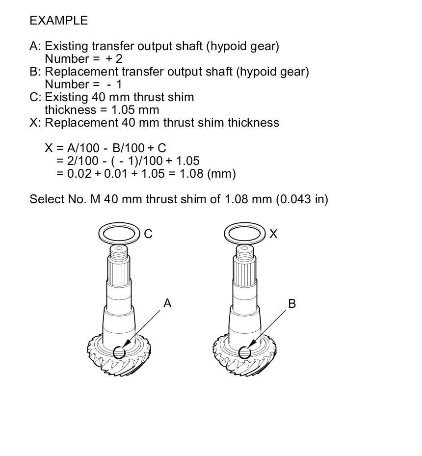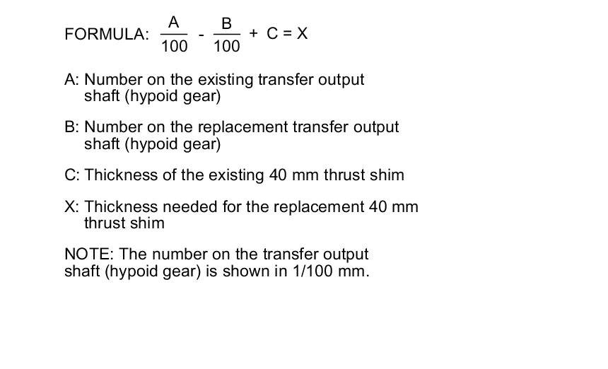 1. Select the 40 mm thrust shim if the transfer output shaft (hypoid gear) is replaced. Calculate the thickness of the 40 mm thrust shim using the following formula, and select the shim from the following table.