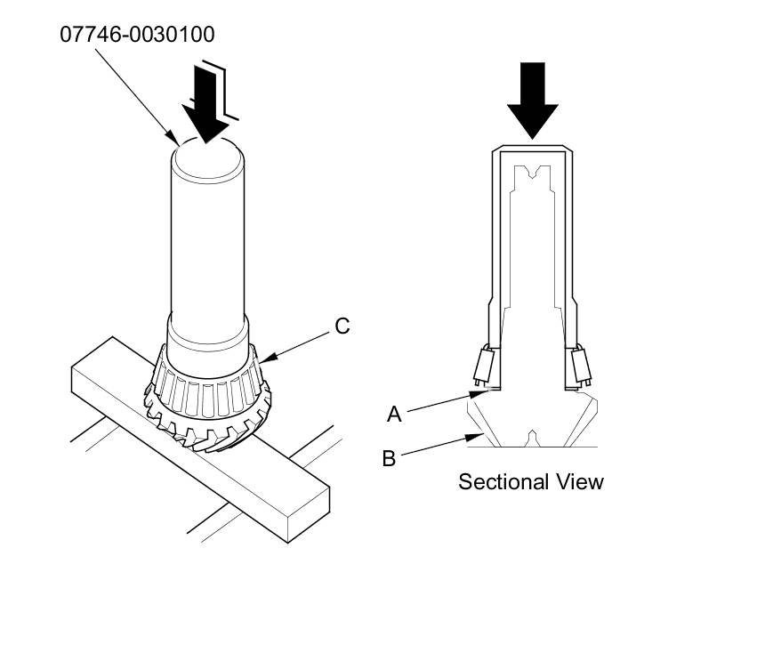 3. Install the 40 mm thrust shim (A) on the transfer output shaft (hypoid gear) (B), then install the tapered roller bearing (C) using the driver handle (40 mm I.D.) and a press.