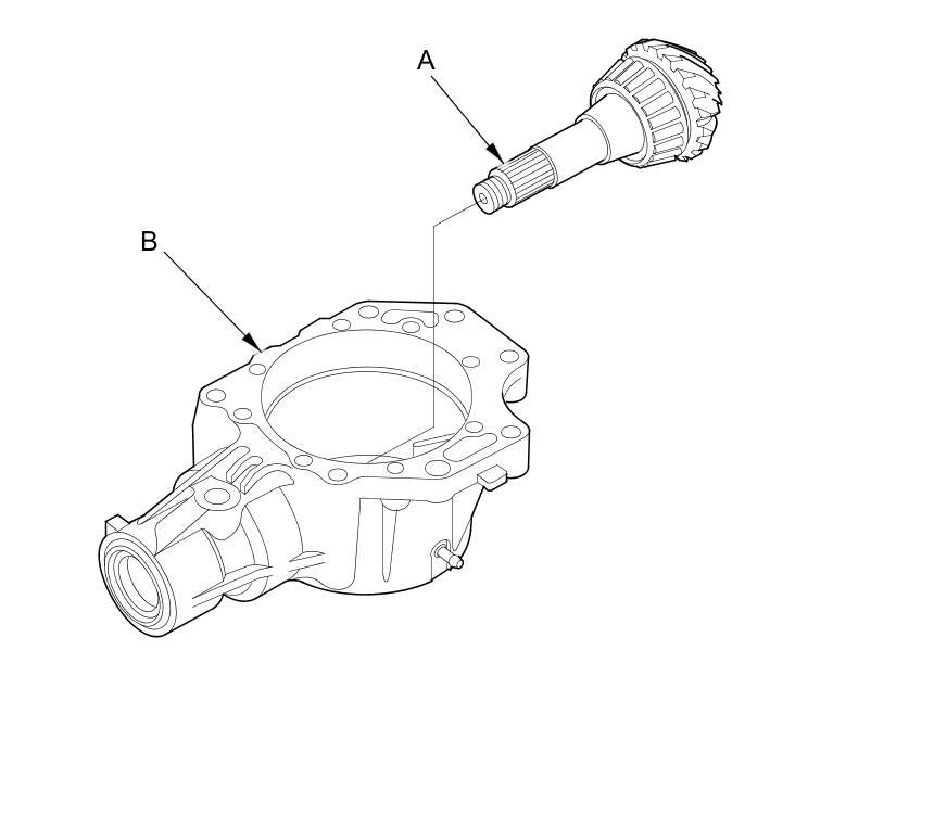6. Install the transfer output shaft (hypoid gear) (A) in the transfer housing (B). Do not install the transfer spacer and the thrust washers on the transfer output shaft (hypoid gear).