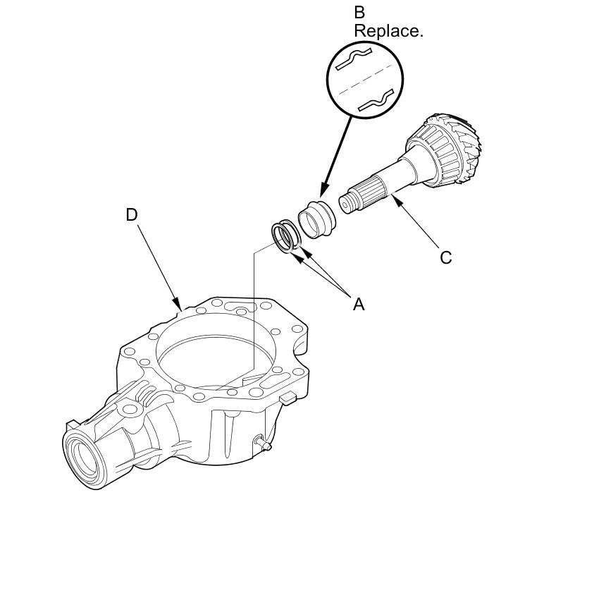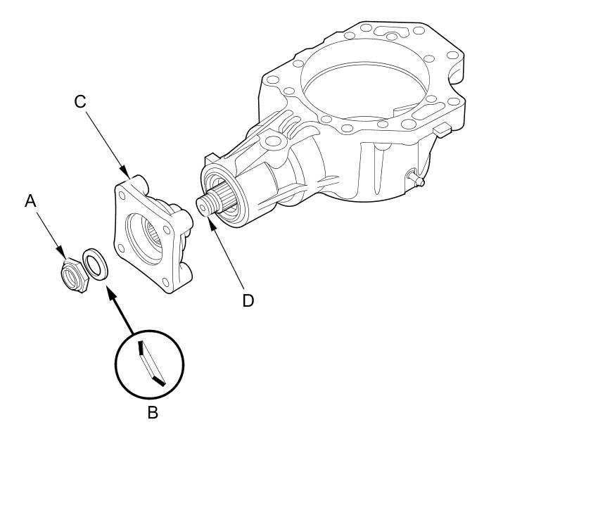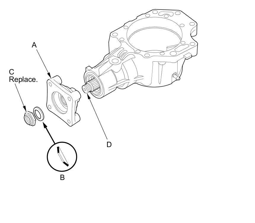 7. Install the companion flange (A), the conical spring washer (B) (in the direction shown), and a new locknut (C) on the transfer output shaft (hypoid gear) (D). Do not install the O-ring and the back-up ring.