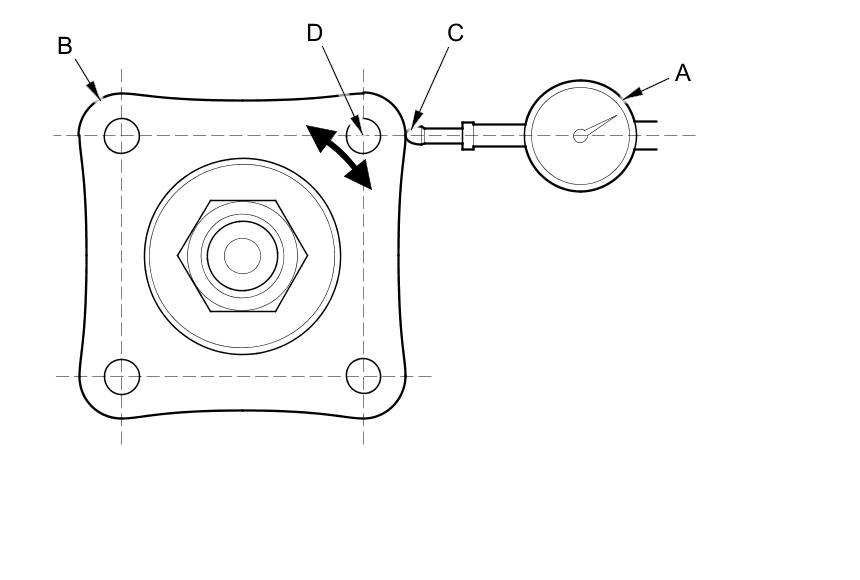 16. Set a dial indicator (A) on the transfer companion flange (B); position the dial indicator tip (C) on the direct extension of the bolt hole center (D).