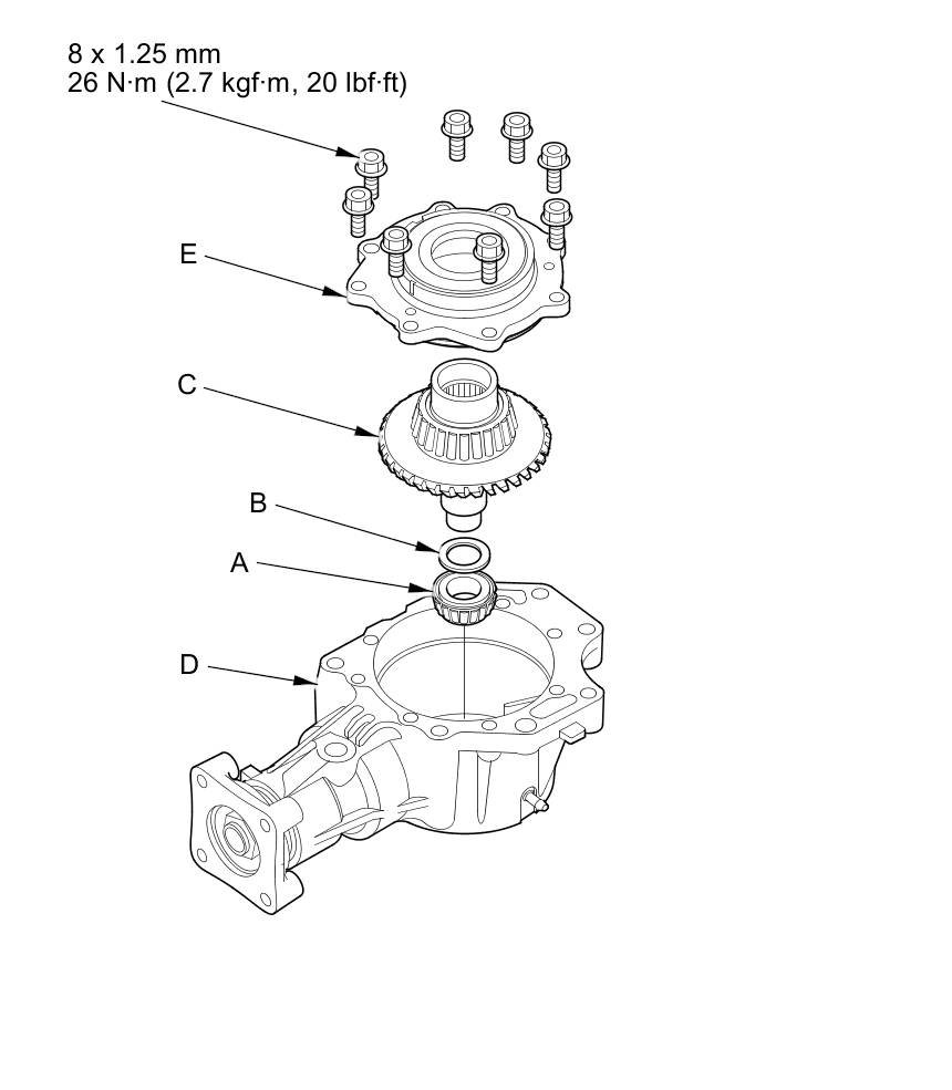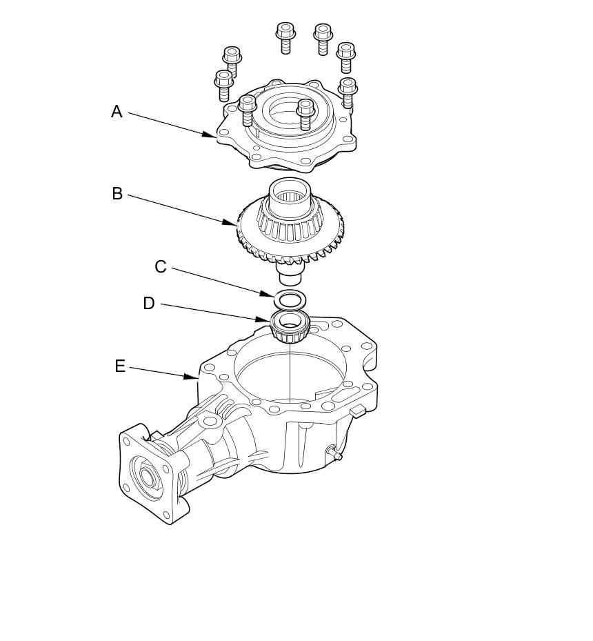 21. Remove the transfer cover (A), the transfer hypoid drive gear/shaft assembly (B), the 25 mm thrust shim (C), and the tapered roller bearing (D) from the transfer housing (E) after adjusting the transfer gear backlash or transfer gear tooth contact.