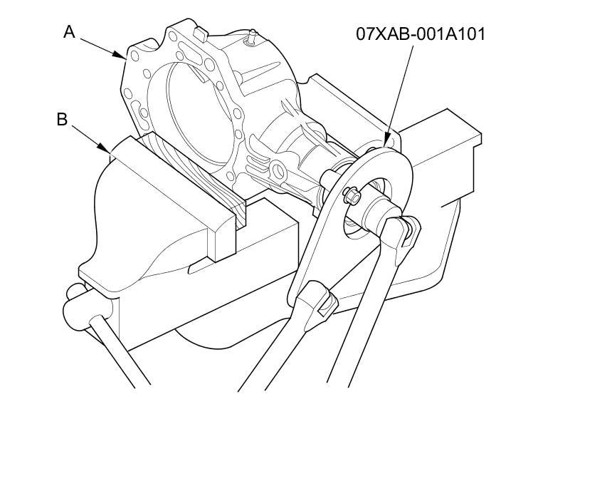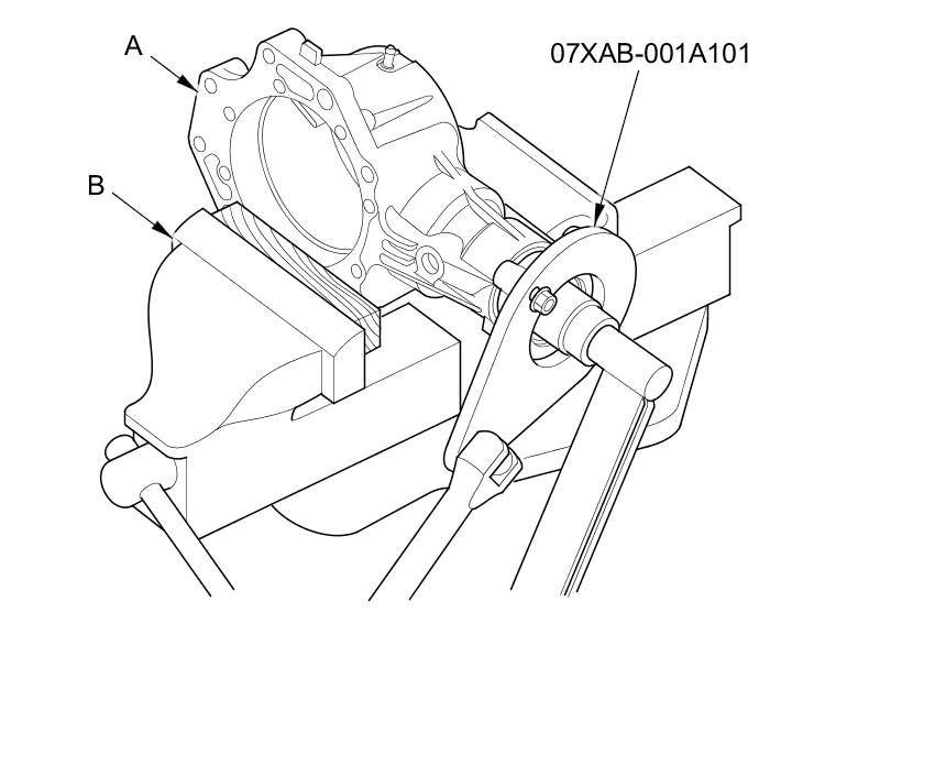 34. Secure the transfer housing (A) in a bench vise (B) with soft jaws. To prevent damage to the transfer housing, always use soft jaws or equivalent materials between the transfer housing and the vise.