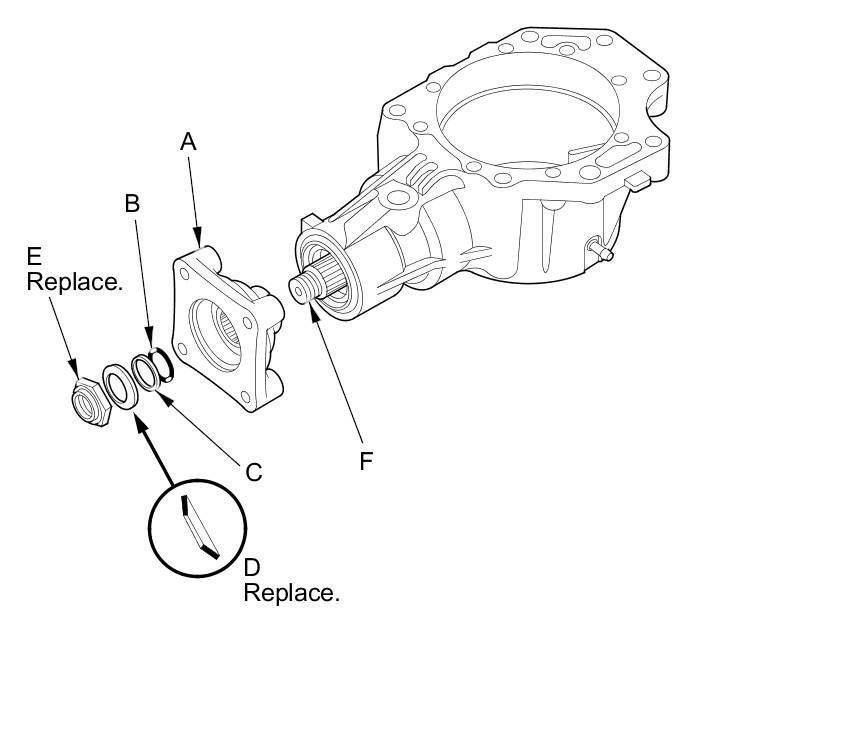 27. Install the companion flange (A), a new O-ring (B), back-up ring (C), a new conical spring washer (D), and a new locknut (E) on the transfer output shaft (hypoid gear) (F). Install the conical spring washer in the direction shown.