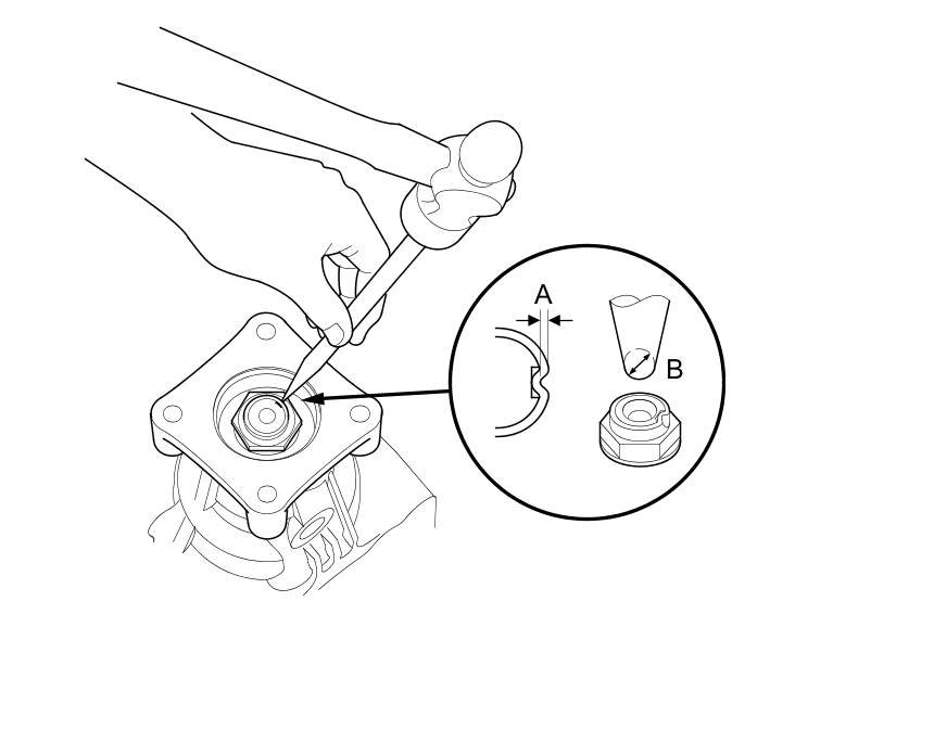 31. Stake the locknut to a depth (A) of at least 0.7 mm (0.03 in) using a 3.5 mm punch (B).