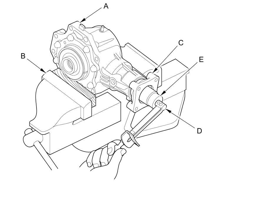 22. Secure the transfer housing (A) in the bench vise (B) with soft jaws, then install the flange holder on the companion flange. To prevent damage to the transfer housing, always use soft jaws or equivalent materials between the transfer housing and the vise.