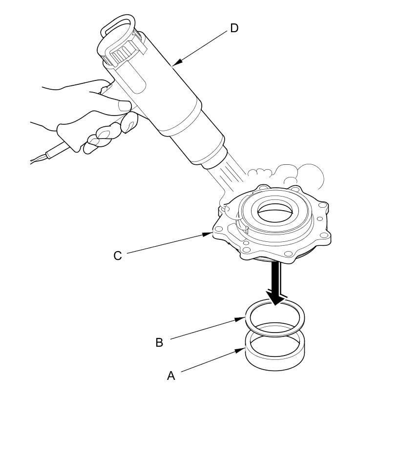 39. Remove the tapered roller bearing outer race (A) and the 80 mm thrust shim (B) from the transfer cover (C). If the tapered roller bearing outer race is press-fitted, remove the tapered roller bearing outer race by heating the transfer cover to about 212 °F (100 °C) using a heat gun (D). Do not heat the transfer cover more than 212 °F (100 °C).