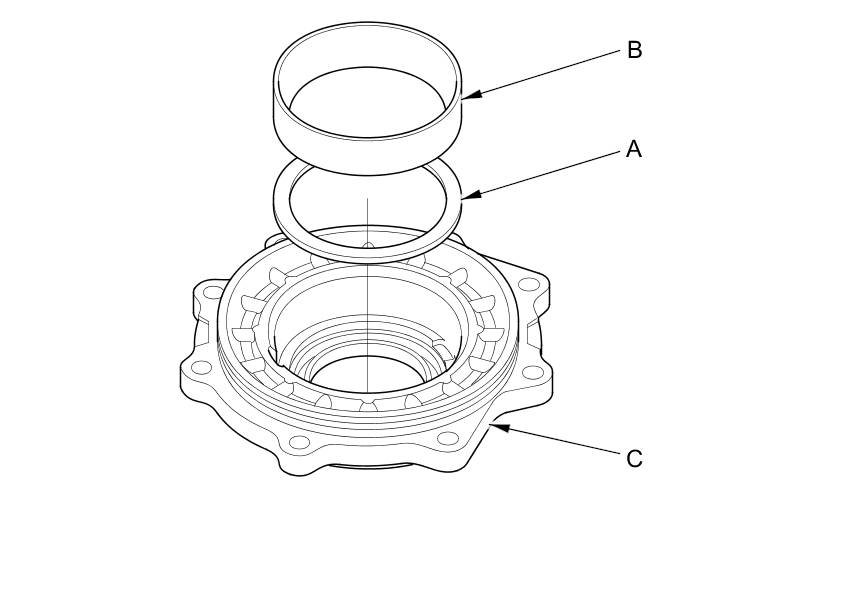 41. Install the 80 mm trust shim (A) and tapered roller bearing outer race (B) in the transfer cover (C).