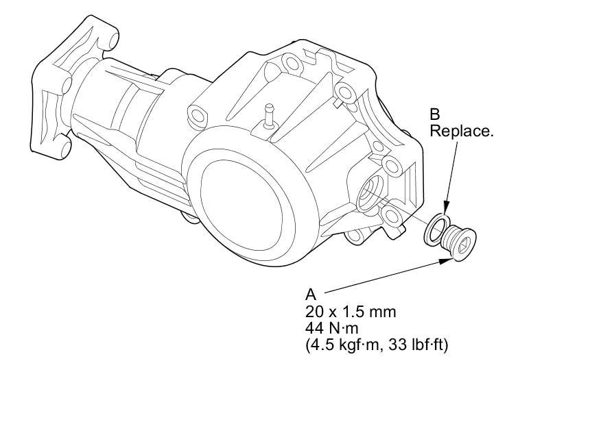 45. Remove the filler plug (A), then refill the transfer assembly with transfer fluid (hypoid gear oil). Use a SAE 90 viscosity hypoid gear oil, API classified GL4 or GL5 only.