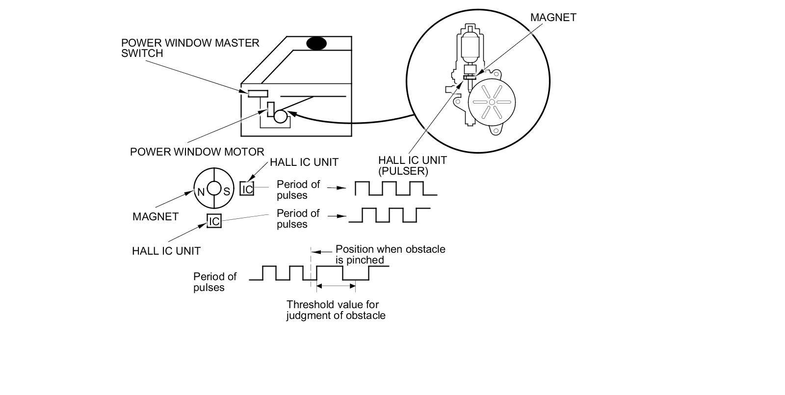 The driver's power window motor incorporates a Hall IC unit (pulse) which generates pulses during the motor's operation and sends the pulses to the driver's power window control unit. As soon as the power window control unit detects a change in the pulses frequency from the Hall IC unit (pulse), the driver's power window control unit makes the power window motor stop and reverse. This is prevent pinching your hand of fingers during auto-up operation.