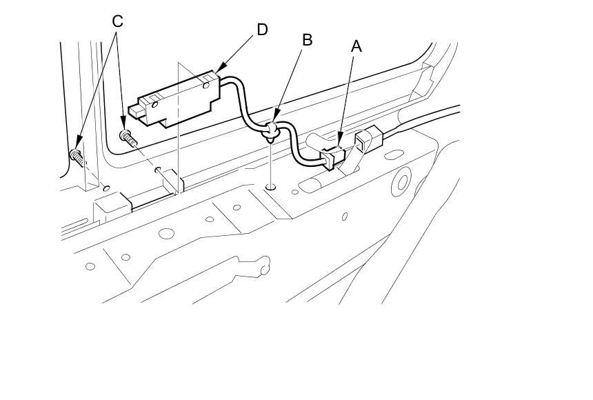 2. Disconnect the connector (A) and detach the harness clip (B). Remove the screws (C), then remove the back power window position switch (D).