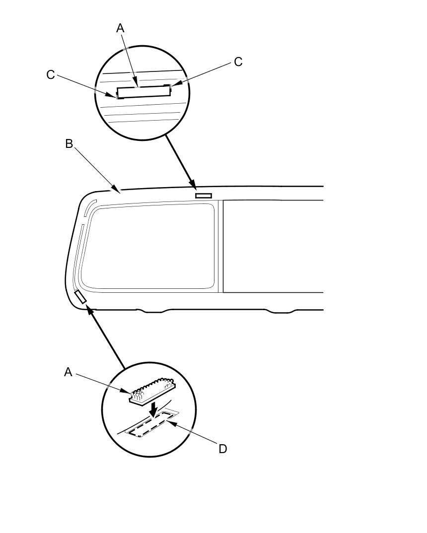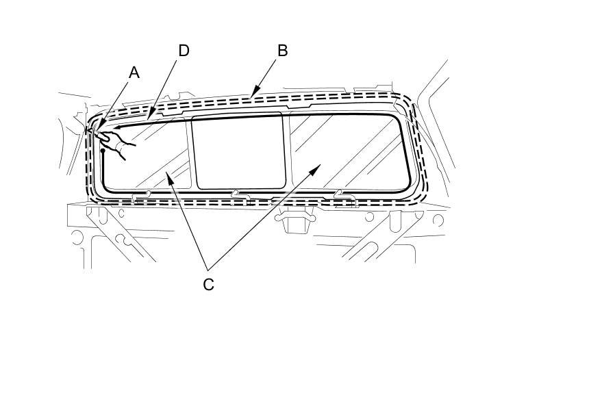 - If the back window (C) will be reinstalled, take care not to damage the molding (D).
