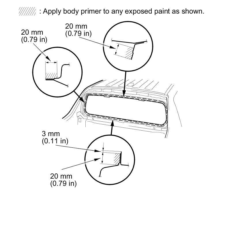 - Never touch the primed surfaces with your hands. If you do, the adhesive may not bond to the back window properly, causing a leak after the back window is installed.