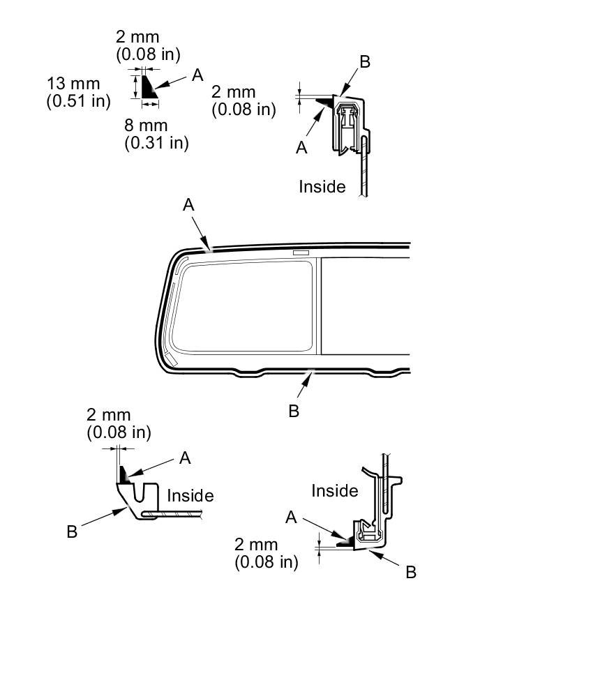 11. Set the back window in the opening, and center it. Make alignment marks (A) across the back window and the body with a grease pencil at the four points shown. Make sure insert nuts (B) are aligned in the body holes (inside). Be careful not to touch the back window molding where the adhesive will be applied.