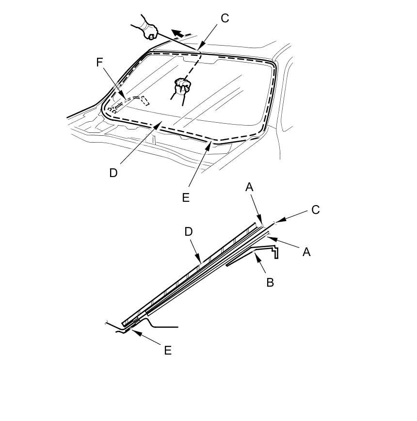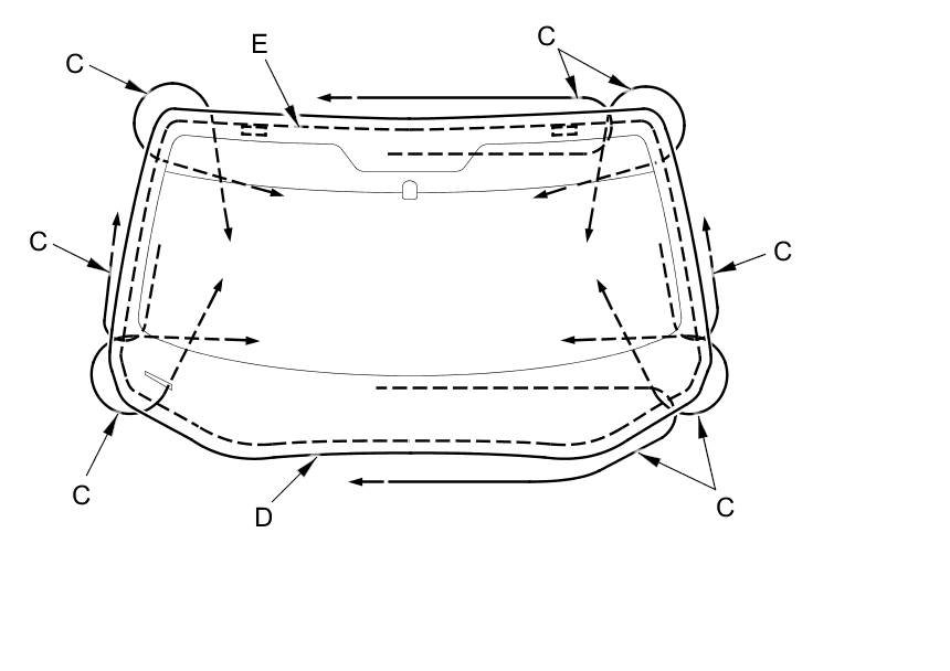 - Be sure the alignment mark (D) of the molding lines up with the alignment mark (E) of the windshield.