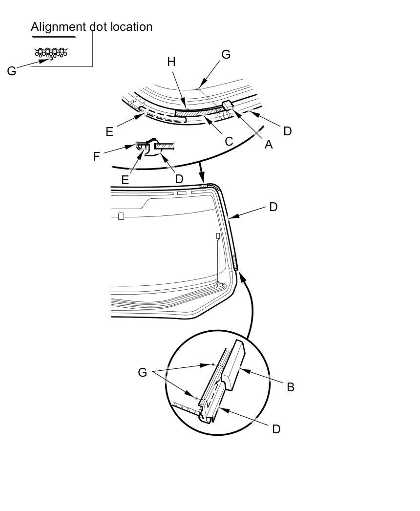 - Be sure the molding rubber lines up with the alignment mark (H) of the molding.