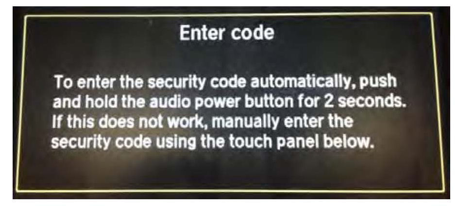 3. Start the engine, and drive the vehicle outside away from buildings, tall trees, and power lines. Press the audio-navigation power button to turn on the audio- navigation unit. When the Enter code screen appears on the audio-navigation display, press and hold the audio power button for about 2 seconds to allow the PCM to verify that the vehicle's VIN matches the VIN saved in the audio-navigation unit. You'll hear a long beep when the audio-navigation unit exits the anti-theft mode. Release the power button.
