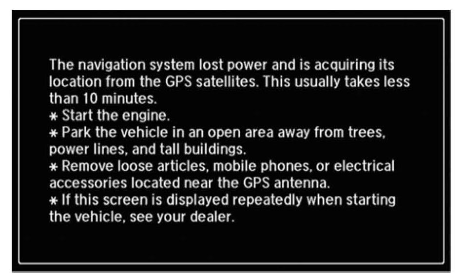5. The instructions below appear on the screen to indicate that the system is initializing (determining its location from the GPS satellites). Follow the on- screen instructions.