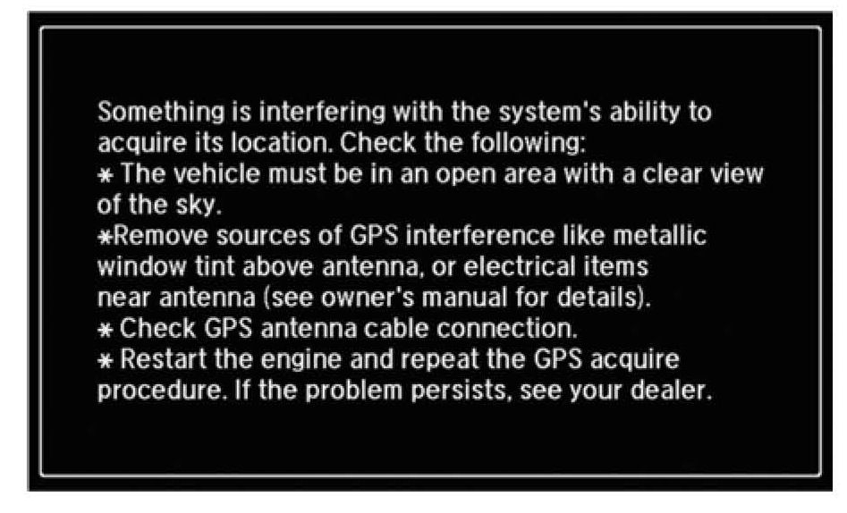 6. If the system does not initialize within 10 minutes, a second screen (shown below) appears. The system is still initializing but will not automatically exit to the globe screen when the initialization is complete. Do not immediately follow the instructions on the screen. After 30 minutes, try restarting the engine to see if the navigation system completed the initialization. If it did not, follow the instructions on the screen.
