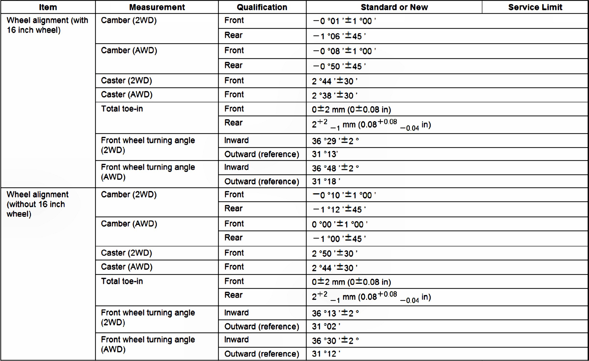 Wheel Alignment Specifications