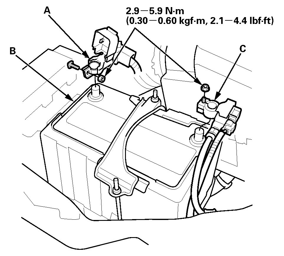 3. Reconnect the positive cable (A) to the battery (B) first, then reconnect the negative cable (C) to the battery.