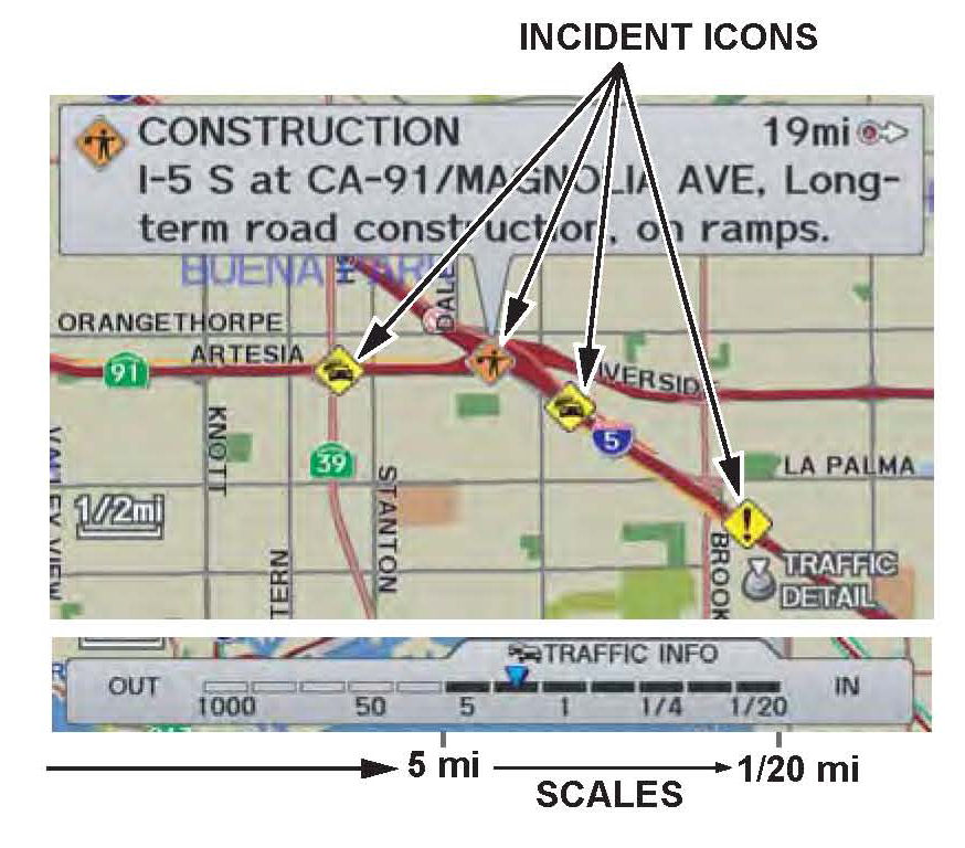 ^ Small diamond-shaped "traffic incident" icons may be shown. If so, scroll over an icon and press in the interface dial to see the details.