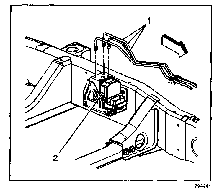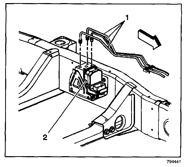 6. Connect the right front brake pipe (1) to the BPMV (2).