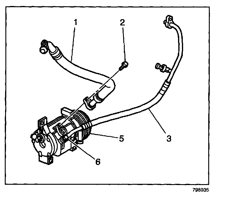 5. Remove the discharge hose (5) from the A/C compressor (4).