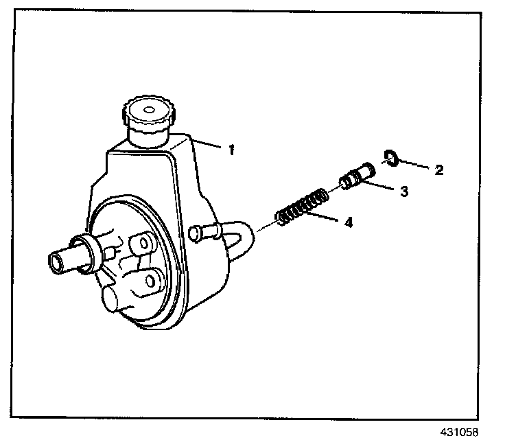 2. Remove the control valve assembly (3) from the pump housing (1). Make sure the flow control spring (4) does not fall out of the pump housing (1).