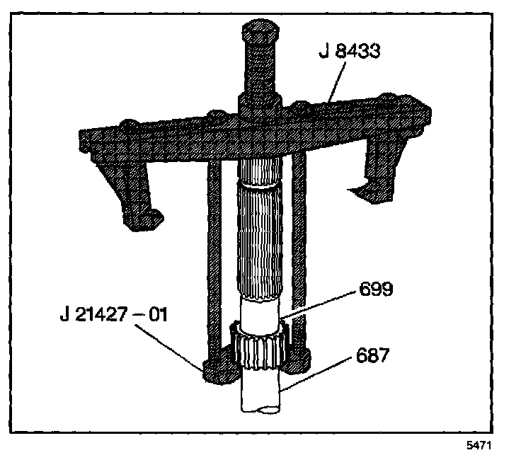 5. Using J 8433 with J 21427-01, remove the internal speed sensor rotor (699) from the output shaft (687).