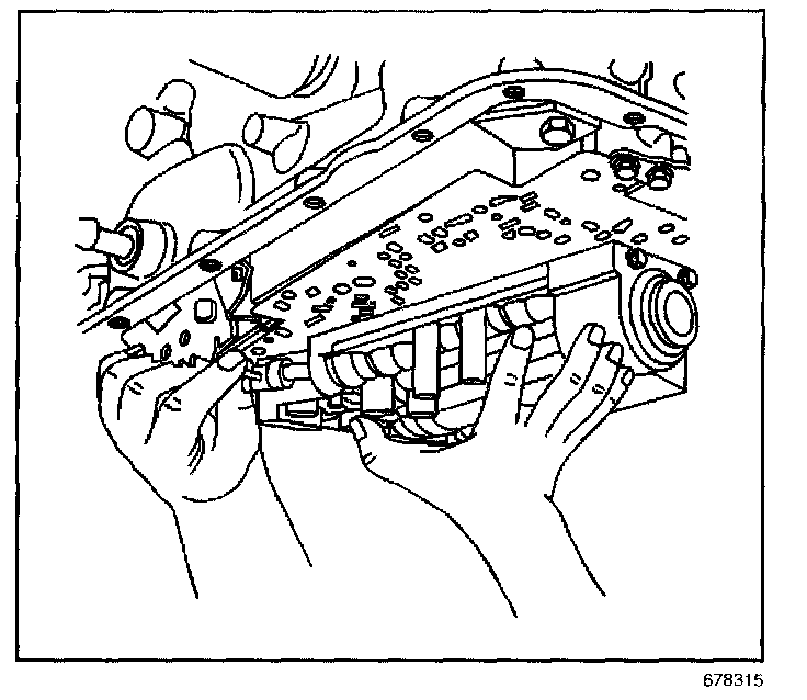 20. Carefully begin to lower the control valve body down from the transmission case while simultaneously disconnecting the manual valve link.