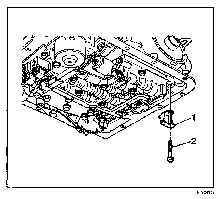 18. Install the transmission fluid indicator stop bracket (1) and bolt (2).