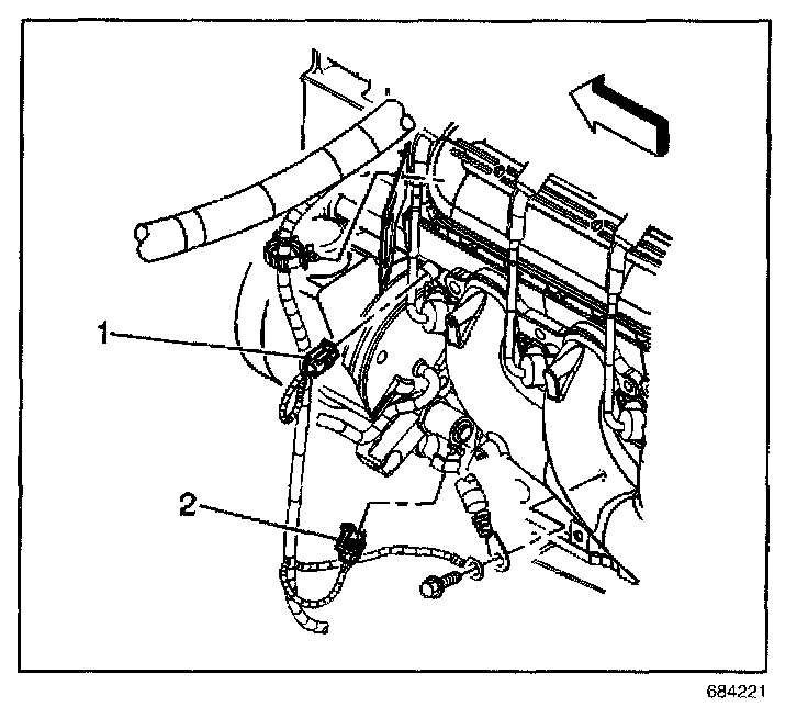 19. Disconnect the manifold absolute pressure (MAP) sensor (1) and knock sensor (2) electrical connectors.