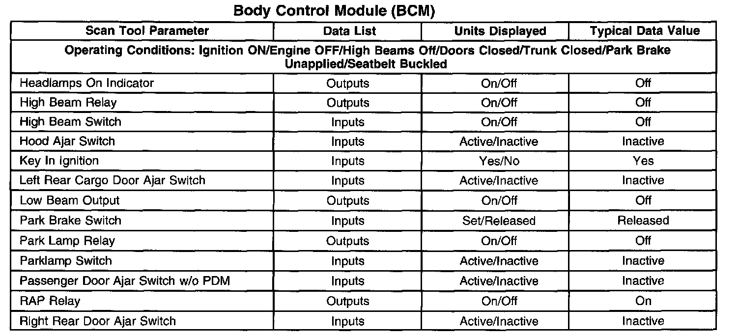 Scan Tool Data List - Body Control Module (BCM) Part 1: