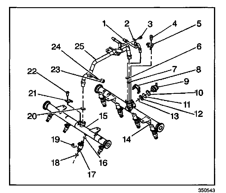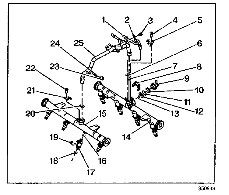4. Remove the crossover pipe rail (25) from the right fuel rail (15).