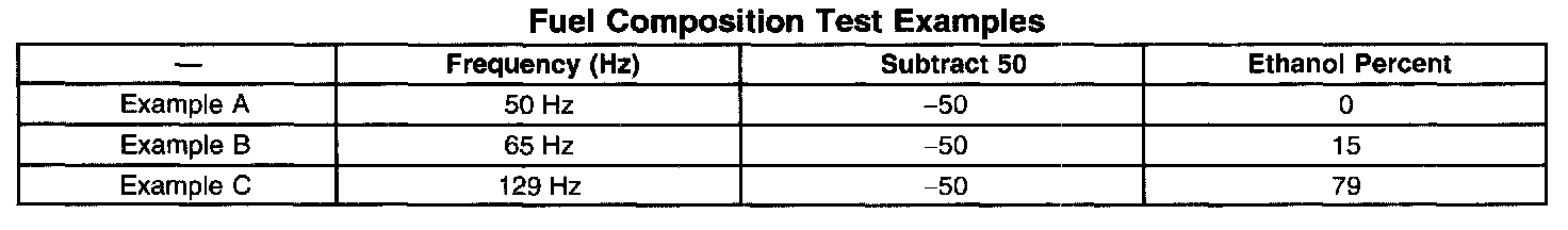 3. Subtract 50 from the reading on the DMM in order to obtain the percentage of alcohol in the fuel sample. Refer to the examples in the Fuel Composition Test Examples table.