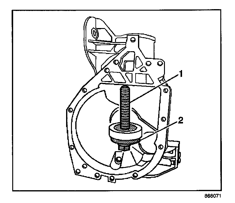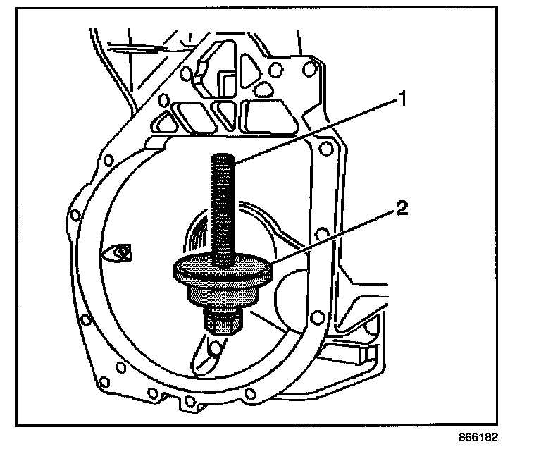 4. Install the forcing screw (1), the J 45754-2 (2) into the inner pinion bearing cup bore.