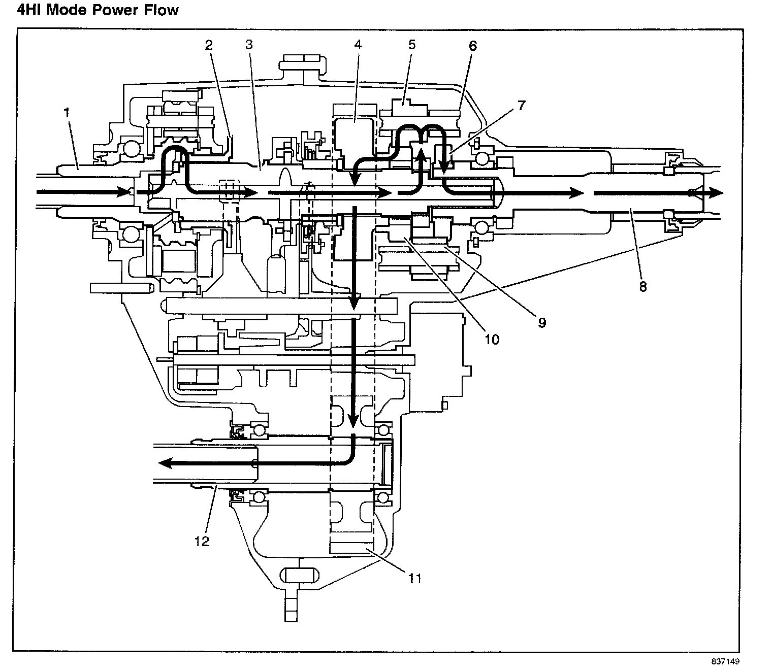 When the BW 4484 is in 4HI mode the engine power flows from the transmission to the input shaft (1). The input shaft (1) is connected to the mainshaft (3) by the high/low range sleeve (2). The high/low range sleeve (2) outer teeth are engaged with the input shaft (1) high-speed teeth. The range collar is slip splined to the mainshaft (3). The mainshaft (3) delivers the power flow to the planetary differential (6). which splits the torque 40 percent through the front differential pinion gears (5) to the front sun gear (10). The torque to the front axle then goes through the drive sprocket (4), via the chain (11) to the front output shaft (12) and to the front axle. The differential planetary splits the torque 60 percent to differential rear pinion gears (9) and rear sun gear (7). The rear sun gear is connected to the rear output shaft (8) and the torque flows to the rear axle. In the 4HI mode, if traction is lost to one axle and the tires spin, the Traction Assist System (TAS) applies braking to the spinning tires and the engine power is delivered to the other tires