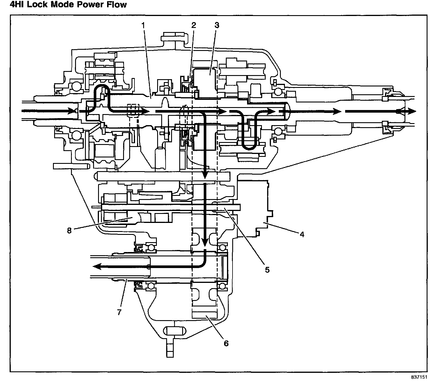 When shifting to the 4HI Lock mode, the encoder motor (4) turns the shift detent lever shaft (5), to rotate the shift detent lever cam (8). The cam action of the shift detent lever cam (8) moves the lockup mode shift fork rearward along with the lockup shift assembly sleeve (2). The lockup shift assembly sleeve (2) locks the mainshaft (1) to the drive sprocket (3). Torque is sent by the chain (6) to the front output shaft (7) and to the front axle. The torque distribution in this mode is now determined by vehicle dynamic conditions and weight distribution. The planetary differential is not operating, and both the front and rear propeller shafts are being driven at equal RPMs, therefore giving a 4 high lock mode. This mode should only be used for extra traction during off road use. Using this mode on dry pavement causes tire scuffing.