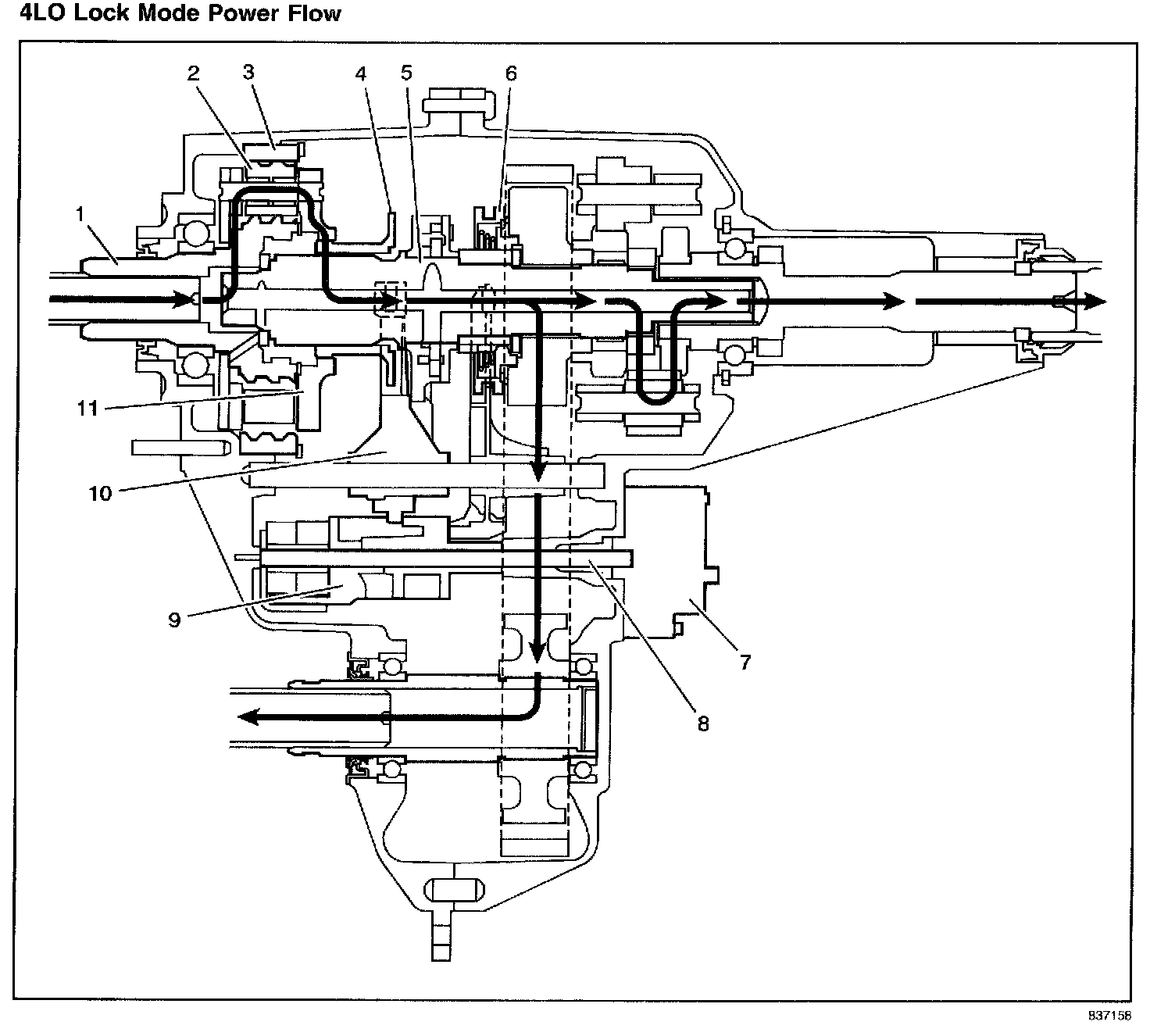 When shifting the transfer case to the 4LO Lock mode, it commands the encoder motor (7) to turn the shift detent lever shaft (8), to rotate the shift detent lever cam (9). The range cam profile on the shift detent lever cam (9) moves the high/range shift fork (10) and the high/low range sleeve (4) rearward to the 4LO Lock range position. The high/low range sleeve (4) outer teeth disengage from the input shaft (1) high-speed teeth. The high/low range sleeve (4) outer teeth then engage in the high/low planetary carrier teeth (11). The power flow is now from planetary teeth on the input shaft (1) to the planetary gears (2) in the carrier. Rotating the planetary gears, which are engaged in the annulus gear (3), rotates the planetary carrier. The planetary carrier delivers the power to the high/low range sleeve (4). The high/low range sleeve (4) then drives the mainshaft (5), providing a 2.64:1 reduction to the speed of the mainshaft (5). When in the 4LO Lock position, the lockup mode shift fork and lockup shift assembly (6) engages in the same way as in the 4HI Lock mode.
