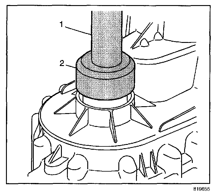 51. Using J 42176 (1) and J 45757 (2), install the mainshaft rear support bushing in the rear output shaft.