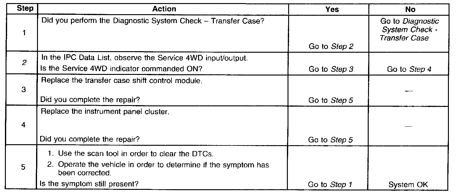 The Service 4WD indicator is located in the instrument panel cluster (IPC), and shares the common power and ground of the IPC. The transfer case shift control module controls the Service indicator by sending the IPC a Class 2 message. This indicator may be controlled with the scan tool using the IPC device controls.