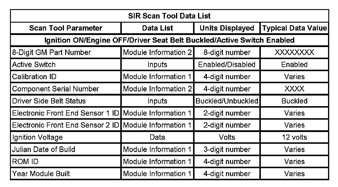 Use the SIR Scan Tool Data List as directed by a diagnostic table or in order to supplement the diagnostic procedures. Begin all of the diagnostic procedures with the Diagnostic System Check - Vehicle in Vehicle DTC Information. Use the SIR Scan Tool Data List after the following are determined: