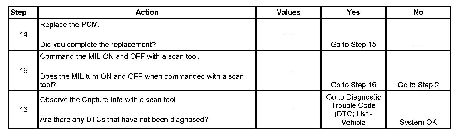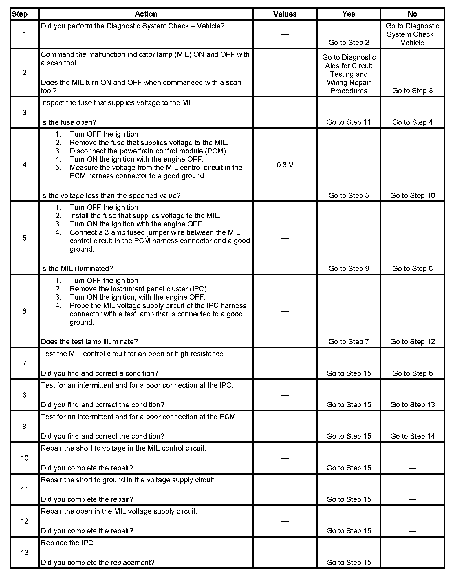 Voltage is supplied directly to the malfunction indicator lamp (MIL). The powertrain control module (PCM) turns the MIL ON by grounding the MIL control circuit. There should be a steady MIL with the ignition ON and the engine OFF.
