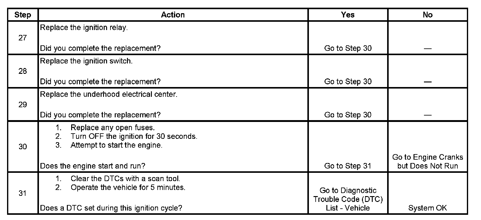 If the ignition relay fails to close, the engine will crank, but will not run. The class 2 communications will be available with the use of a scan tool.