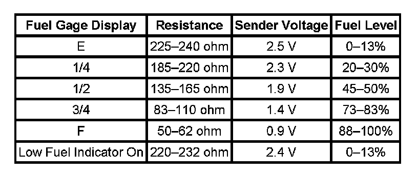 The information in this table is intended for use with the J 33431-C Signal Generator and Instrument Panel Tester. The fuel level sensor values represent the test values to be used on the Signal Generator to drive the fuel gage display to the indicated positions. Vehicles that require more than one fuel level sensor calculate gage position from many possible resistance combinations of fuel levels between the two tanks. Therefore, the values in the table may not correlate directly to readings taken from the vehicle primary or secondary sending units.