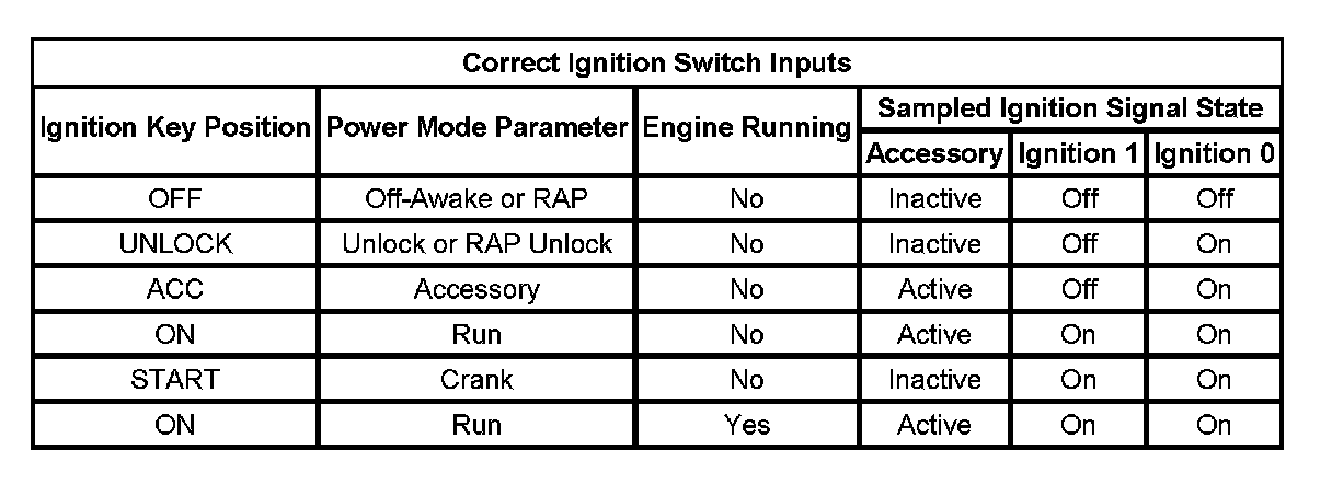 Those modules that have discrete ignition signal inputs also remain in the state dictated by the last valid BCM message received on the serial data circuits. They then check the state of their discrete ignition input to determine the current valid state. If the discrete ignition input is active, B+, the modules will fail-safe to the RUN power mode. If the discrete ignition input is not active, open or 0 voltage, the modules will fail-safe to OFF-AWAKE. In this state the modules are constantly checking for a change status message on the serial data circuits and can respond to both local inputs and serial data inputs from other modules on the vehicle.