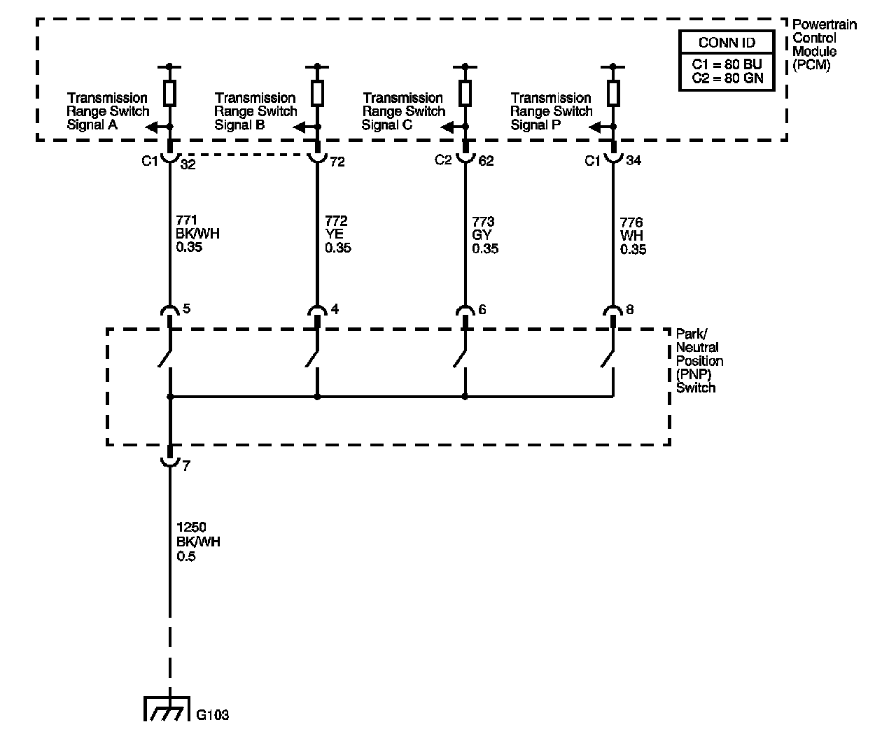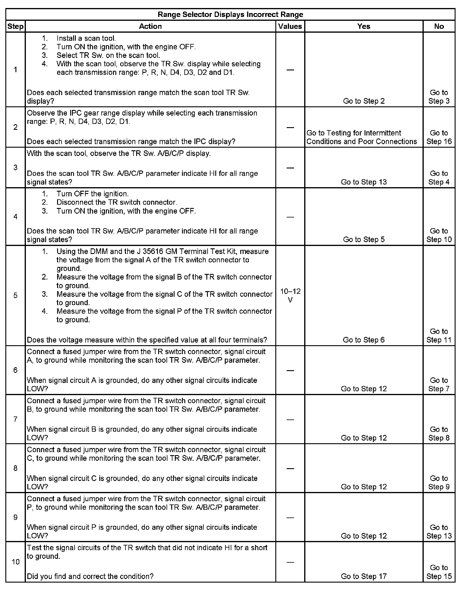 Refer to the Transmission Range Switch Logic table for valid combinations of switch signal circuits A, B, C and Parity. On the table, HI indicates an ignition voltage signal. LOW indicates a zero voltage signal.
