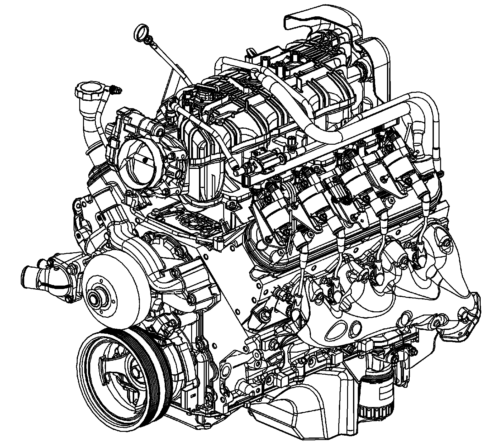 The intake manifold is a 1-piece composite design that incorporates brass threaded inserts for mounting the fuel rail, throttle body, and wire harness studs. Each side of the intake manifold is sealed to the cylinder head by a non-reusable silicone sealing gasket/nylon carrier assembly. The electronically actuated throttle body bolts to the front of the intake manifold. The throttle body is sealed by a 1-piece push in place silicone gasket. The fuel rail assembly, with 8 separate fuel injectors, is retained to the intake by 4 bolts. The injectors are seated into their individual manifold bores with O-ring seals to provide sealing. A fuel rail stop bracket is retained to the rear of the left cylinder head by a mounting bolt. The manifold absolute pressure (MAP) sensor is installed and retained to the top front of the intake manifold and sealed by an O-ring seal. The evaporative (EVAP) emission canister purge solenoid valve is mounted to the fuel rail at the left front of the intake manifold. There are no coolant passages within the intake manifold.