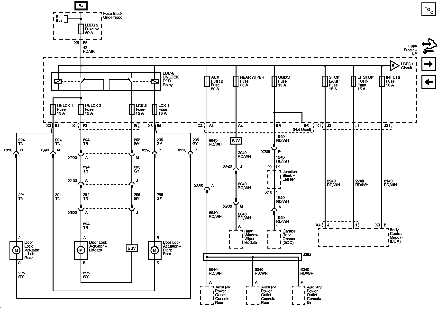 LBEC 2, AUX PWR 2, REAR WIPER, UGDO, STOP LAMP, LT STOP TURN, INT LTS Fuses and LOCK/UNLOCK PCB Relay